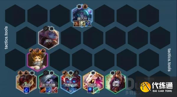 陣容過渡核心是崔絲塔娜小炮,千萬不要選黑默丁格。首先黑默丁格的裝備跟維迦的裝備非常重疊,其次黑默丁格的傷害非常不穩定,而且容易假賽。相對來說崔絲塔娜的物理輸出在前期是最穩定的,而且過渡起來也是非常簡單。