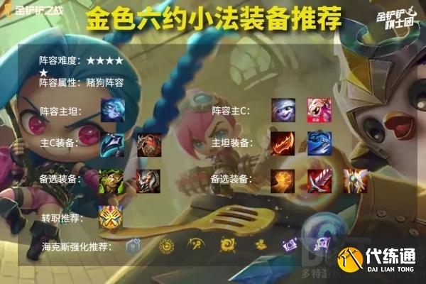 黃金六約小法是一套賭狗陣容,而且是所有賭狗陣容里面對于質量要求最高的。約德爾羈絆是在下一回合在每次對玩家的戰斗之后,1名隨機的【約德爾人】會被免費添加到你的備戰席中。這樣約德爾全員3星的概率會大大增加(沒有同行的情況下)