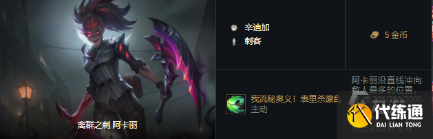 阿卡麗的技能可以沖向站位集中的敵人之中,對其造成高額的魔法傷害并標記7秒,當有標記目標的血量到了15%/25%/90%以下,阿卡麗沖過來穿透目標,將目標直接斬殺并對沿途敵人造成魔法傷害。首先玩家可以看到阿卡麗的分兩段,第一段AOE加標記,第二段斬殺+AOE。并且阿卡麗的法力值上限為50,技能非常容易觸發,毫無疑問阿卡麗已經成了S6刺客體系的唯一大C。也正是阿卡麗的過于強勢,給了很多玩家S6刺客非常厲害的感覺,但是作為5費卡拿不到阿卡麗,刺客就是第八出門。