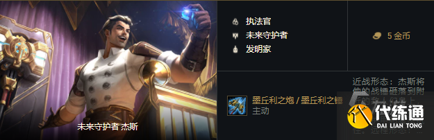 杰斯的在S6是一張非常靈活的卡,未來守護者的羈絆讓他可以當前排也可以當后排,所以玩家可以跟據自己的陣容來選擇杰斯放什么位置。但是杰斯的上場率并不高,一般只在發明體系或者執法關英雄中。