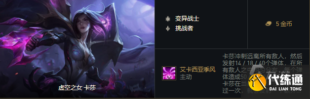 卡莎可以遠離敵人,并對敵人發射多個彈體,并且平A次數可以增加卡莎的彈體數量。遠離敵人保證了卡莎的生存能力,彈體的總傷害非常高,但是可惜是均勻分布的,這導致卡莎的爆發并沒有很高,算是一張中規中矩的五費卡。