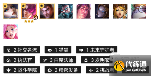 陣容羈絆:兩社交名流一貓貓一未來守護者兩執法官三白魔法師三發明家兩戰斗學院兩精密發條兩挑戰者兩學者。