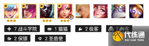 陣容羈絆:七戰斗學院一貓貓兩極客兩刺客兩保鏢來領圣盾使。