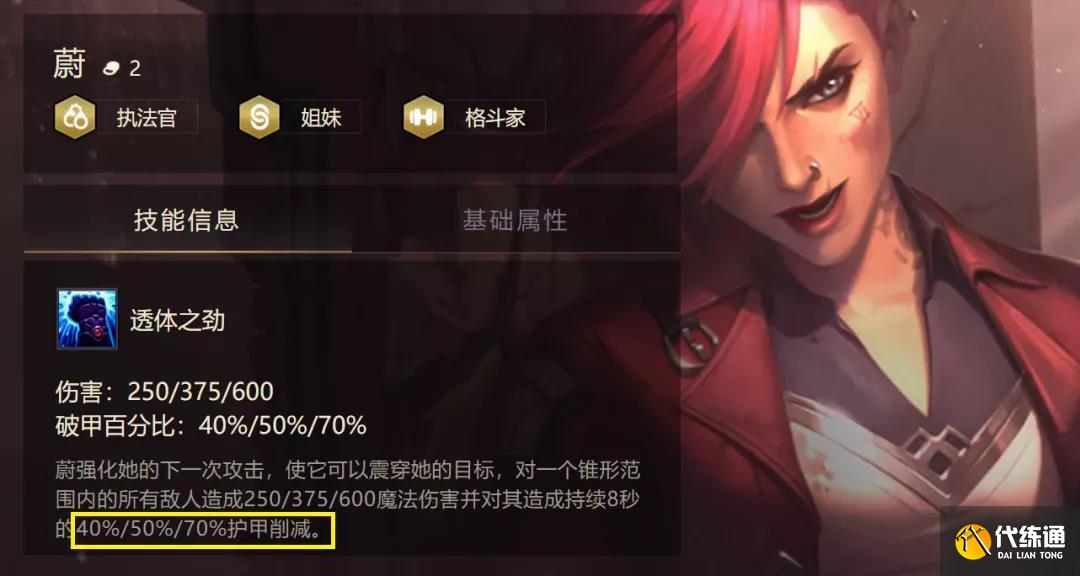 比如蔚這個2費棋子,作為為數(shù)不多的3羈絆棋子,蔚在陣容中與金克絲搭配成姐妹羈絆,這樣自身技能距離就提升2格,釋放技能就可給更多的敵方棋子造成一個8秒的50%破甲效果(2星);另一方面2姐妹羈絆還對金克絲也是極大增強,只要參與擊殺金克絲就能增加可疊加的40%攻速,純物理輸出的金克絲多次疊加攻速直接就起飛了。