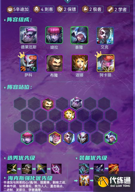 辛迪加刺這次更新的坦度略有下降,但陣容上限十分高,如果能有2星阿卡麗,吃分與吃雞會十分穩定,且主養小丑在前中期過渡相當穩定,但陣容相當吃5階段運營與阿卡麗能否2星。