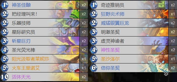 爐石傳說最新版本圣契騎卡組代碼分享。爐石傳說因為大法術法徹底消失了,現在圣契騎出來了,下面小編會給大家帶來具體的爐石傳說最新版本圣契騎卡組代碼分享。圣契騎卡組代碼1、這一套卡組起手留斬星巨刃、樂器技師、虛靈神諭者、奇跡推銷員。2、我們在前期的時候提到減費,中期刷幾個神性圣契。3、后期大家就可以萊尼沙 閱讀全文...