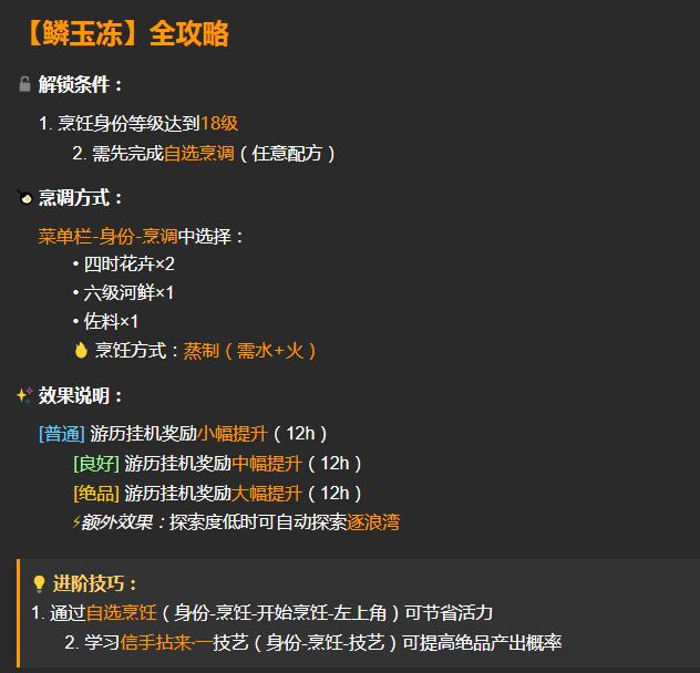 逆水寒手游鱗玉凍配方及材料怎么獲取?逆水寒手游中的鱗玉凍是一種烹飪配方,想要解鎖這個(gè)配方需要滿足條件,很多玩家想知道鱗玉凍配方及材料怎么獲得?下面就跟著小編一起來看看逆水寒手游鱗玉凍配方及材料獲取方法。 逆水寒手游鱗玉凍配方及材料獲取方法 解鎖條件: 1.烹飪身份等級(jí)達(dá)到18級(jí) 2.需先完成自選烹 閱讀全文...
