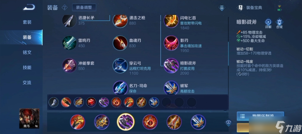 銘文搭配以物理穿透和攻擊加成為主,推薦10鷹眼、10隱匿、5禍源5無雙的組合。鷹眼提供物理穿透增強前期傷害,隱匿的移速加成彌補典韋腿短缺陷,禍源與無雙混合搭配平衡暴擊率與暴擊效果。這套銘文使典韋在四級后具備強勢單殺能力,尤其配合二技能的極限攻速加成,能快速疊加被動層數(shù)。若側(cè)重生存能力,可將部分禍源替換為宿命,但會略微降低爆發(fā)上限。 技能連招需根據(jù)戰(zhàn)局靈活調(diào)整,基礎(chǔ)連招為大招起手接二技能減速并觸發(fā)攻速加成,隨后普攻輸出,一技能用于解控或追擊。蹲草時可先手大招接二技能,確保敵人無法逃脫。需注意典韋的二技能命中敵方英雄才能觸發(fā)吸血和攻速增益,因此釋放時機需精準(zhǔn)。一技能的解控效果是反打關(guān)鍵,切忌提前交掉。被動層數(shù)疊加依賴擊殺或助攻,前期應(yīng)避免無意義消耗,多參與小規(guī)模團戰(zhàn)積累優(yōu)勢。 團戰(zhàn)打法上,典韋需后手進場切后排,避免先手被集火。利用地形和大招位移繞后,優(yōu)先攻擊射手或法師。若敵方控制較多,可提前開啟一技能免疫減速或眩暈。逆風(fēng)局需以帶線牽制為主,利用反甲和紅蓮斗篷的清兵能力拖延節(jié)奏。順風(fēng)局則需主動入侵野區(qū)壓制經(jīng)濟,憑借裝備碾壓正面推進。"> 典韋的核心出裝需兼顧生存與爆發(fā),常規(guī)六神裝推薦抵抗之靴、反傷刺甲、暗影戰(zhàn)斧、宗師之力、魔女斗篷及名刀司命。抵抗之靴提供韌性減少控制時間,反傷刺甲是典韋對抗物理輸出的核心裝備,能反彈傷害并配合大招被動強化輸出。暗影戰(zhàn)斧和宗師之力提升冷卻縮減與暴擊率,確保技能銜接流暢且普攻爆發(fā)力強。魔女斗篷針對法師威    閱讀全文...