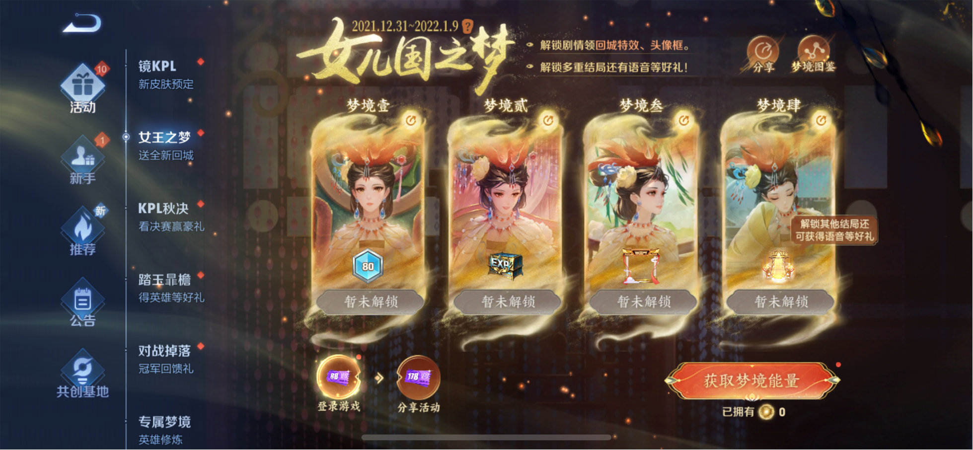 王者榮耀女兒國之夢夢境能量獲取方法分享,王者榮耀有夢境能量才可以開啟夢境,開啟夢境還需要消費夢境能量繼續體驗夢境并解鎖新的劇情支線,那么夢境能量怎么收集到呢?今天就給大家帶來了獲取方法,讓我們一起看下吧。 王者榮耀夢境能量怎么得 【夢境能量】 活動期間完成每日任務和累計任務即可獲得夢境能量開啟夢 閱讀全文...