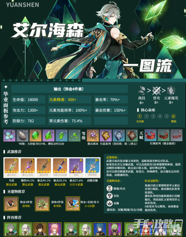 《原神》3.7艾爾海森養成攻略,來看艾爾海森天賦加點、武器、圣遺物、陣容推薦。 艾爾海森是炙手可熱的草系主c,核心機制為調度「琢光鏡」進行輸出。普通攻擊可以通過「琢光鏡」獲得草元素附魔以及觸發E的光幕傷害,Q也可通過「琢光鏡」提高傷害次數。 具有多種輸出手法,可靈活選擇站場或速切進行輸出,配隊主要 閱讀全文...