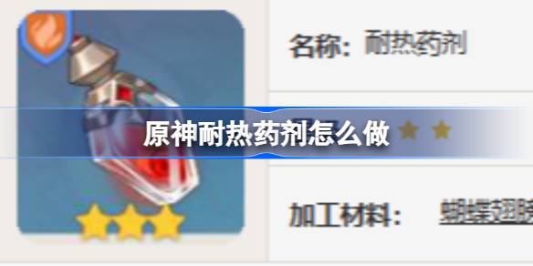 原神有很多食物可以制作,可以為旅行者提供一些生命回復,體力恢復以及其他增益效果,其中的耐熱藥劑大家知道怎么做嗎?下面為大家?guī)淼木唧w內(nèi)容,感興趣的玩家們千萬不要錯過哦! 原神耐熱藥劑怎么做? 名稱:耐熱藥劑 星級:三星 加工材料:蝴蝶翅膀*1 烈焰花花蕊*1 描述:讓人忍耐高熱的奇特藥劑,能提 閱讀全文...