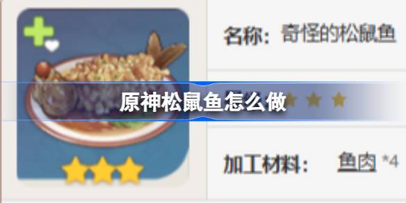 原神有很多食物可以制作,可以為旅行者提供一些生命回復(fù),體力恢復(fù)以及其他增益效果,其中的松鼠魚大家知道怎么做嗎?下面為大家?guī)淼木唧w內(nèi)容,感興趣的玩家們千萬不要錯過哦! 原神松鼠魚怎么做? 名稱:奇怪的松鼠魚 星級:三星 加工材料:魚肉*4 番茄*2 面粉*2 糖*1 描述:工藝復(fù)雜的魚料理。勉 閱讀全文...