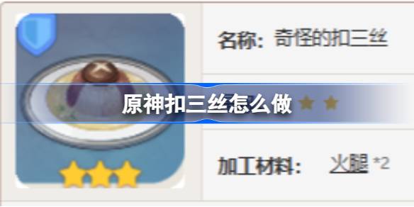 原神有很多食物可以制作,可以為旅行者提供一些生命回復,體力恢復以及其他增益效果,其中的扣三絲大家知道怎么做嗎?下面為大家帶來的具體內容,感興趣的玩家們千萬不要錯過哦! 原神扣三絲怎么做? 名稱:奇怪的扣三絲 星級:三星 加工材料:火腿*2 禽肉*2 竹筍*1 蘑菇*1 描述:造型齊整的菜肴。乍 閱讀全文...