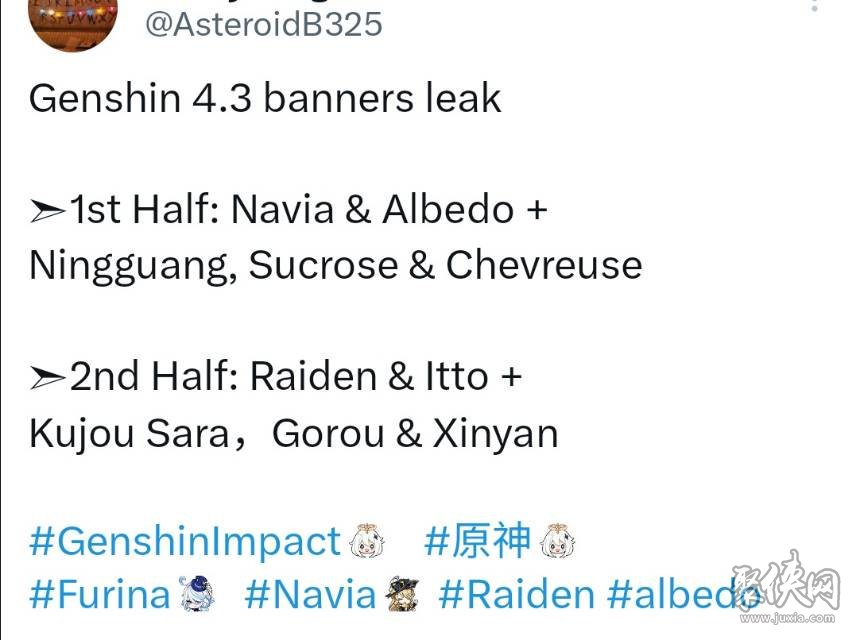 原神4.3版本up什么角色?很多原神玩家們平時最為關(guān)注的就是未來的卡池角色了,現(xiàn)在游戲的版本是4.1版本,很多玩家們的眼光很長遠,現(xiàn)在已經(jīng)開始關(guān)注4.3版本的卡池了,正好現(xiàn)在外網(wǎng)上,也就是推特上的原神內(nèi)鬼已經(jīng)爆出了最真實的卡池解包信息,大家就來看看吧。 原神4.3版本內(nèi)鬼卡池解包信息 如下圖所示, 閱讀全文...