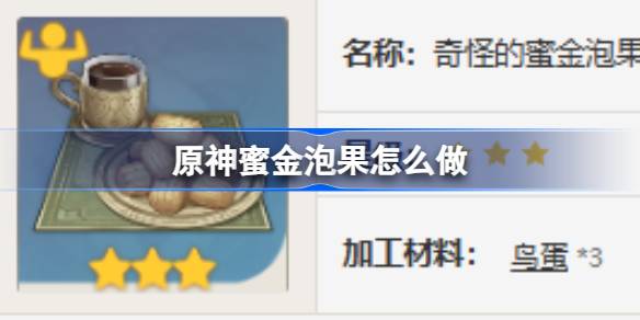 原神有很多食物可以制作,可以為旅行者提供一些生命回復(fù),體力恢復(fù)以及其他增益效果,其中的蜜金泡果大家知道怎么做嗎?下面為大家?guī)淼木唧w內(nèi)容,感興趣的玩家們千萬不要錯過哦! 原神蜜金泡果怎么做? 名稱:奇怪的蜜金泡果 星級:三星 加工材料:鳥蛋*3 面粉*2 糖*2 咖啡豆*1 描述:油炸而成的甜 閱讀全文...