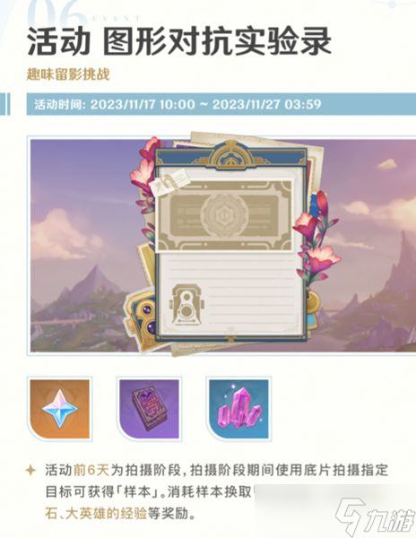 原神是一款十分有趣的模擬闖關游戲,玩家們能夠進行自定義的冒險嘗試,4.2圖形對抗實驗錄活動獎勵也是很多樣化的,拍攝任務模式也很簡單,這里小編準備了具體的攻略,感興趣的玩家可以來九游關注一下哦! 原神圖形對抗實驗錄活動分享 一、活動時間 1、該活動將于11月17日10:00-11月27日3:59期間    閱讀全文...