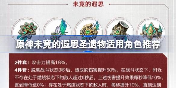 【未竟的遐思】是原神4.6版本即將上線的全新圣遺物套裝,很多玩家想知道原神未竟的遐思圣遺物適合哪些角色?以下是小編為大家?guī)淼脑裎淳沟腻谒际ミz物適用角色推薦,一起來看看吧!原神未竟的遐思圣遺物適合哪些角色【未竟的遐思】這件給可以觸發(fā)燃燒的隊伍使用的,雖然需要燃燒,但是也不是說只能走燃燒,比如觸發(fā)燃 閱讀全文...