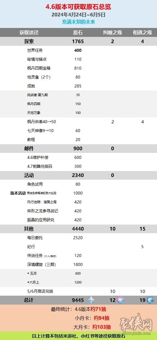 原神4.6版本無氪白嫖玩家能攢多少原石?在原神中,最為重要的游戲道具毫無疑問就是可以拿來抽卡的原石了,那么在未來即將上線的4.6版本里,很多玩家們也是在關注自己可以在未來的4.6版本里獲取多少原石了,那么下面讓小編給大家統計和計算一下吧。原神4.6版本原石數量統計在4.6版本中,零氪玩家能獲得944 閱讀全文...