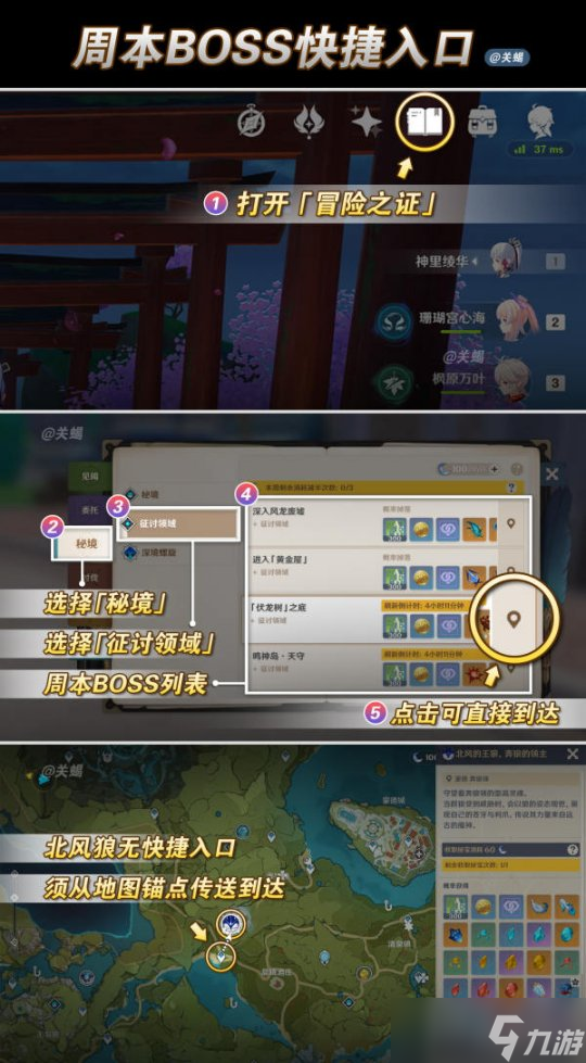 (一)按角色查BOSS表 角色頭像背景的顏色代表對應(yīng)的元素顏色,頭像外框的顏色代表星級 每行的角色出場順序:優(yōu)先5星角色(金色框)其次4星角色(紫色框) 圖表右側(cè)是全周本名單、方位、各元素玉石掉落對應(yīng)的BOSS參照表 (二)按BOSS查角色表 與(表一)同理,角色頭像背景的顏色代表對應(yīng)的元素顏色,頭像外框的顏色代表星級,即金色框(5星角色)和紫色框(4星角色)。 每行的角色出場順序按各自的元素顏色排列: 火→水→風(fēng)→雷→草→冰→巖→主角 ------結(jié)合頭像背景元素顏色+出場順序=可以更快速的找到所需要的角色(只看顏色即可快速定位) (三)按BOSS查角色表(淺色簡潔版) 不包含角色名字、星級顯示,按照排序可以更加直觀快速的觀測到角色頭像背景的元素顏色,對于已經(jīng)熟記全角色名字、星級和元素的大佬來說查找更快捷高效,甚至不用放大圖表 每行的角色出場順序按各自的元素顏色排列: 火→水→風(fēng)→雷→草→冰→巖→主角 ------結(jié)合頭像背景元素顏色+出場順序=可以更快速的找到所需要的角色(只看顏色即可快速定位) "> 【V4.6版本】本次更新包含了新角色「仆人」阿蕾奇諾,以及其他全部角色天賦突破升級所需要的周本秘境材料對照表 周本BOSS快捷入口: 目前截至V4.6版本,一共10個(gè)周常BOSS,其中9個(gè)(包括新周本「仆人」)可以從「冒險(xiǎn)之證」里快捷傳送,只有「北風(fēng)的王狼」無快捷入口,需要從地圖手動到達(dá) 原神 閱讀全文...