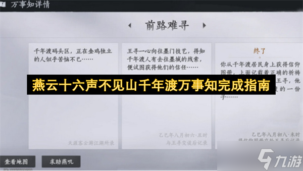 《燕云十六聲》不見山版本開放后,千年渡區域的萬事知任務分為【前路難尋】與【仙宮仙宮】兩個部分。任務有分支結局,需要根據選擇的書冊決定走向。下面小編將帶來燕云十六聲不見山千年渡萬事知完成指南,希望能夠幫助到各位。 燕云十六聲不見山千年渡萬事知完成指南 前路難尋 1、傳送至千年渡界碑,身后直走,與N 閱讀全文...